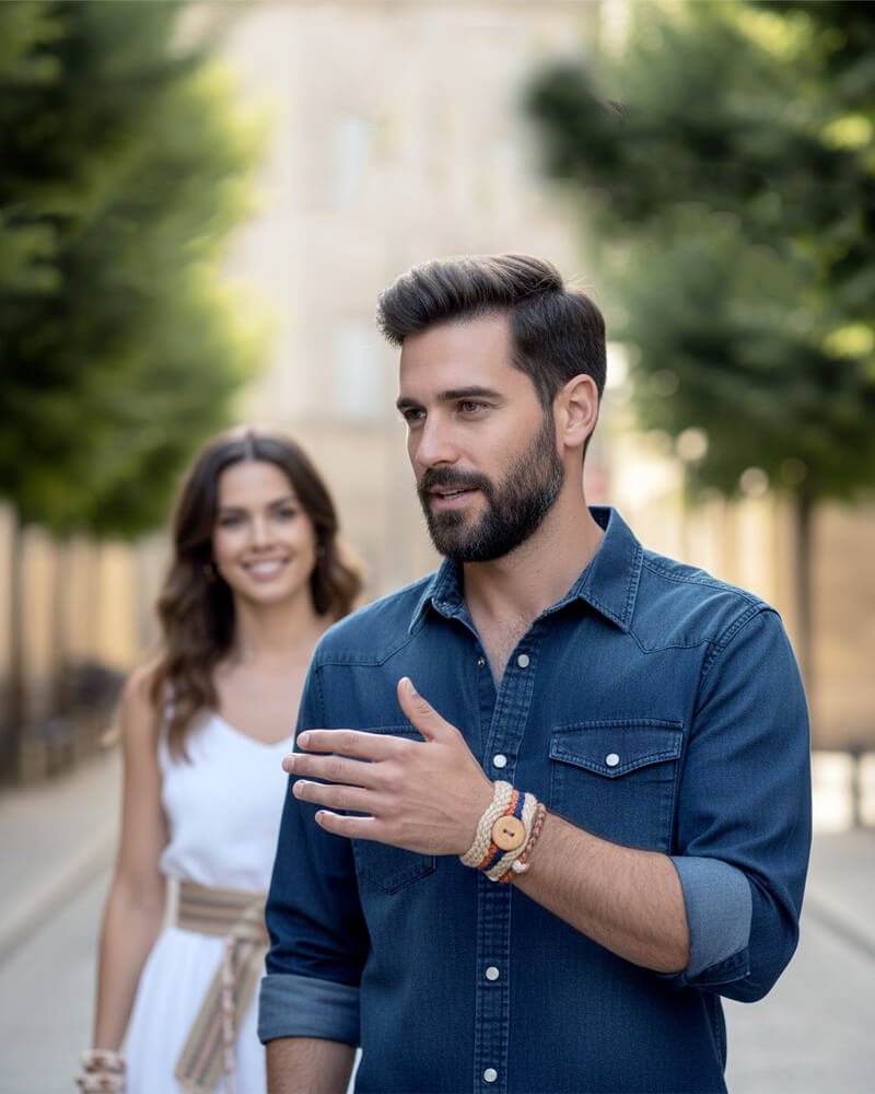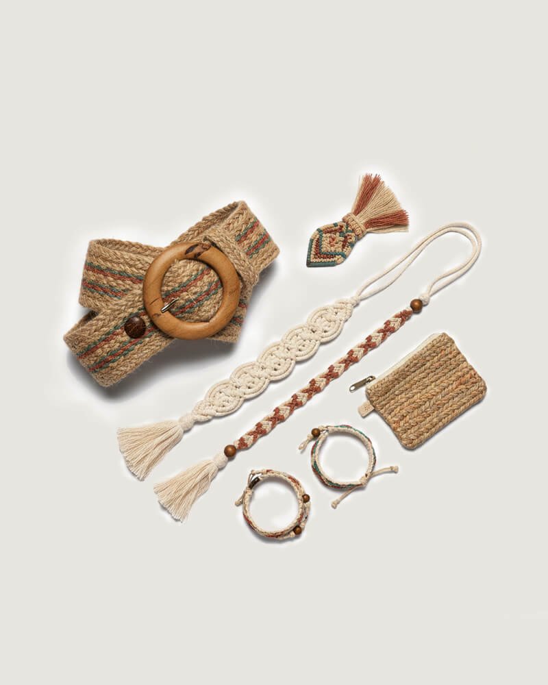 Materials: Handwoven Jute Fiber, Braided Cotton, Natural Wood (beads, rings, buttons), Eco-friendly Dyes