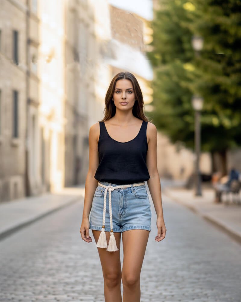 Braided Rope Belt: 0.5″ W, adjustable length with tassels.